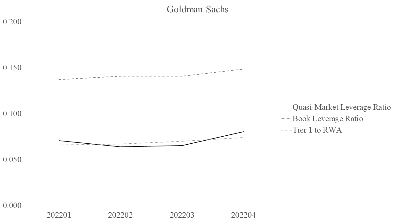 Goldman Sachs’s risk-based measure also exceeds the other two measures, and the quasi-market leverage ratio is similar to its book leverage ratio and both lie above 5 percent.
