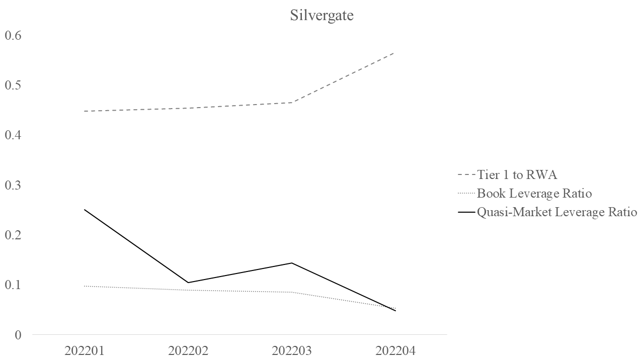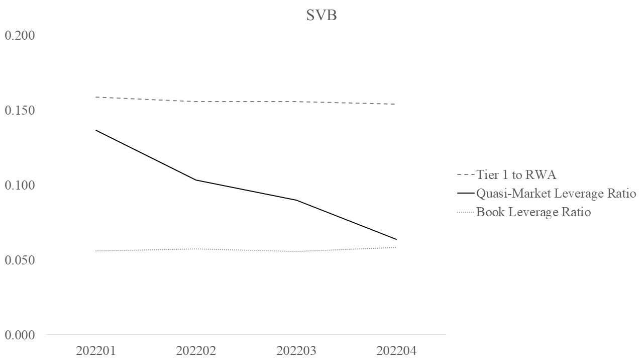 SBV’s risk-based capital measure exceeds the other two measures. SVB had a very high quasi-market leverage ratio (nearly 15 percent) in early 2022, much higher than the book leverage ratio which equaled only about 6 percent. But throughout 2022, the market value of equity fell dramatically, reflecting the fact that some equity investors could have been withdrawing from the bank.