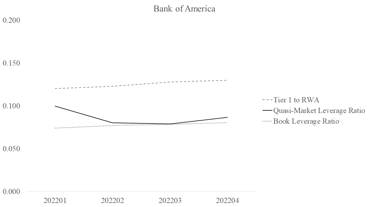 The Tier 1 to risk-weighted asset ratio, the key capital ratio under the Basel framework makes Bank of America appear well capitalized. However, the quasi-market and book leverage ratios appear lower, with the latter lying above the former through Q4 2022, above 5 percent.
