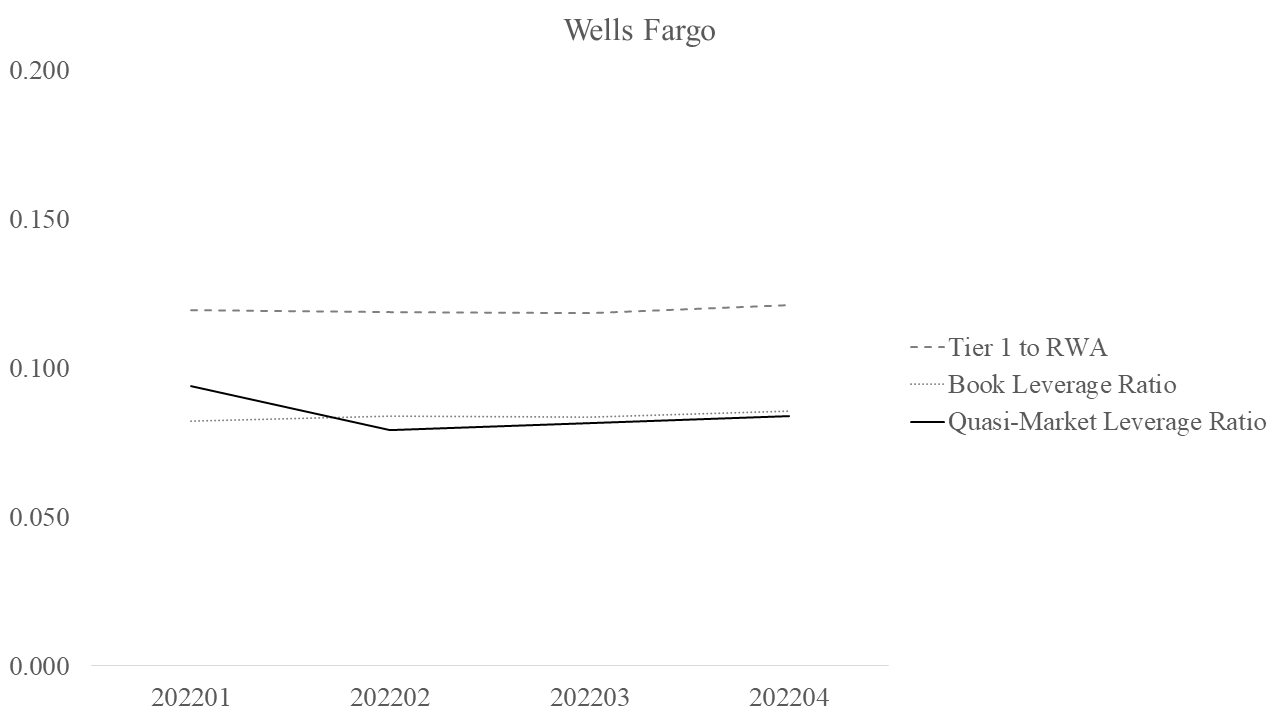Wells Fargo’s risk-based measure also exceeds the other two measures. The quasi-market leverage ratio is just under the book leverage ratio but both are above 5 percent.