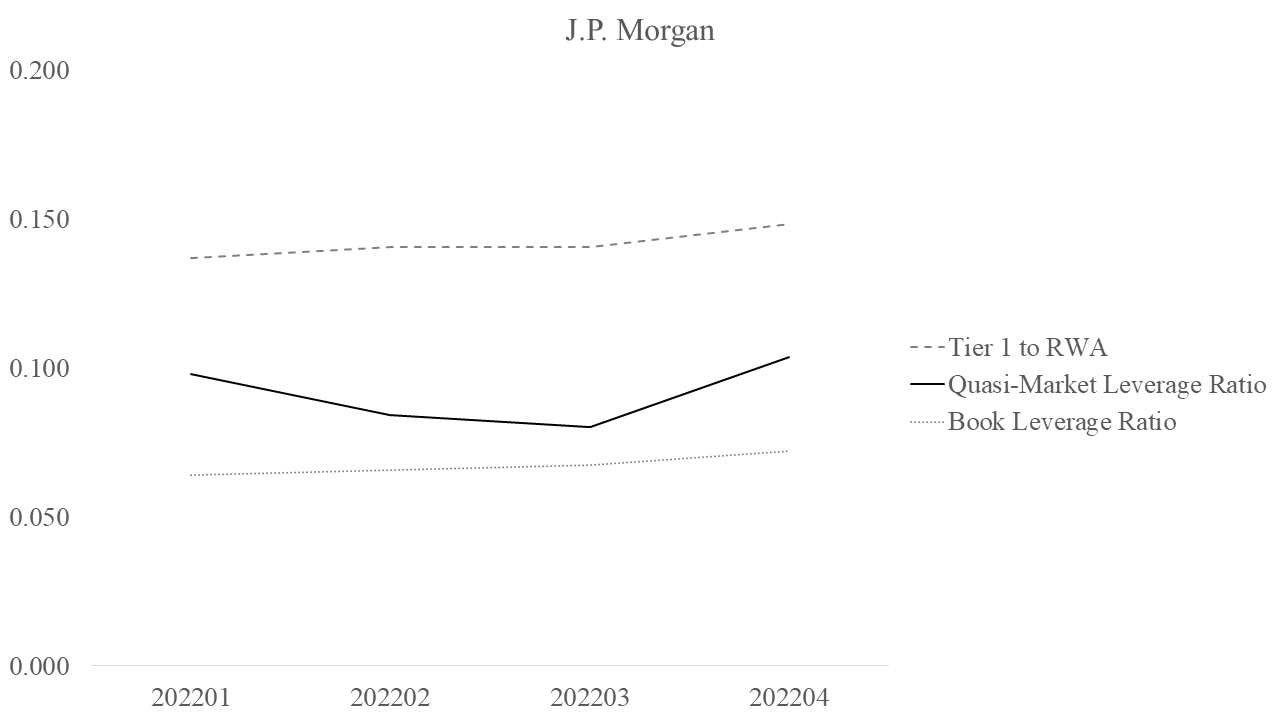 J.P. Morgan’s risk-based measure also exceeds the other two measures. The quasi-market leverage ratio lies above the book leverage ratio, and in the most recent quarter, it lies above 10 percent.