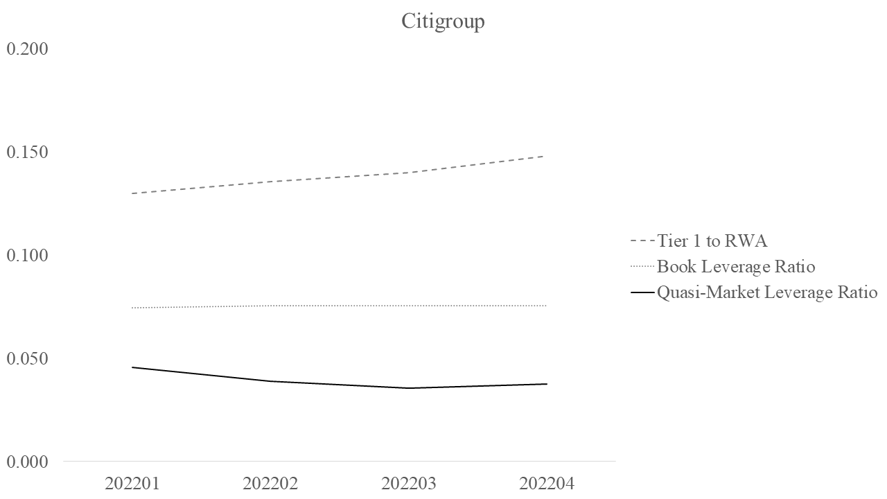 With Citigroup, the risk-based measure also exceeds the other two measures. Also, the quasi-market leverage ratio lies below the book leverage ratio, and is now under 5 percent. While that's better than at the peak of the 2008 crisis, that remains something to watch.