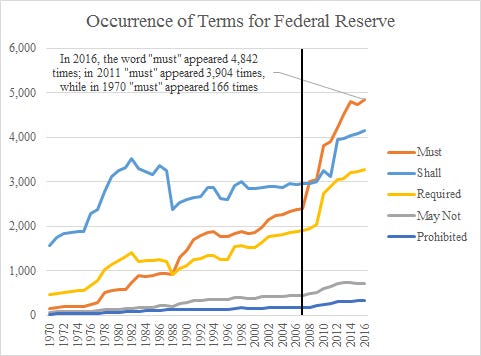 The figure below depicts the time paths of the occurrence of the five terms within Federal Reserve regulatory restrictions. The Federal Reserve has the most regulatory restrictions among the three regulators, as I showed in the previous post, and again “must” takes the lead.