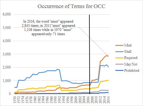 The figure below depicts the time paths of the occurrence of the five terms within OCC regulatory restrictions; the black vertical line indicates the start of the 2007–2009 crisis. Much of the rise of “must” appears in 2012, as relative to 2011 the occurrence of the term grew by 79%.