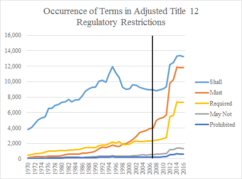 Lastly, for the adjusted measure of Title 12 regulatory restrictions, “shall” remains the term that appears most frequently, although “must” has closed the gap. Much of the rise of “must” appears in 2012, as relative to 2011 the occurrence of the term grew by 54%.
